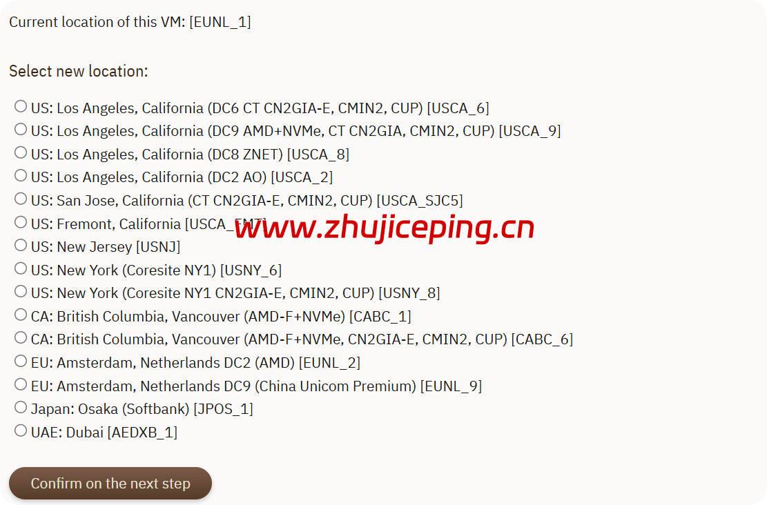 下面就是刚刚购买的 CN2 GIA-E 套餐后台的机房切换页面,购买的时候选择了 EUNL_1,但是会发现可选机房列表里面并没有这个 EUNL_1,只有其他两个 EUNL_2 和 EUNL_9,所以其实就意味着迁出之后就无法再迁入 EUNL_1。